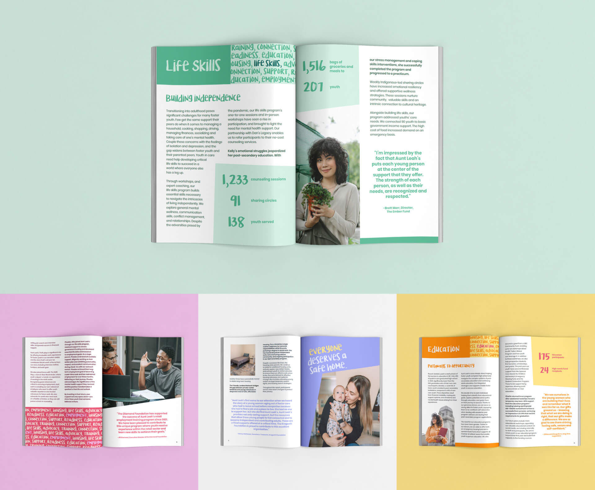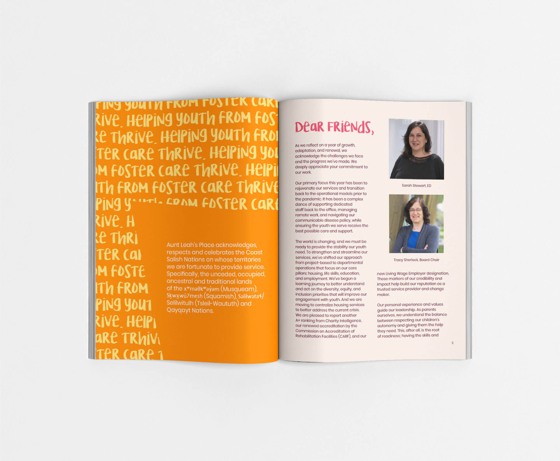 Aunt Leah's is a non-profit which works with youths in fostercare and at-risk mothers. I worked with Spur Communications to design their 2022-2023 annual report, after Aunt Leah's underwent a recent rebrand. Their new brand is full of bold colours and expressive typography, which were were able to play with throughout the design of this report.